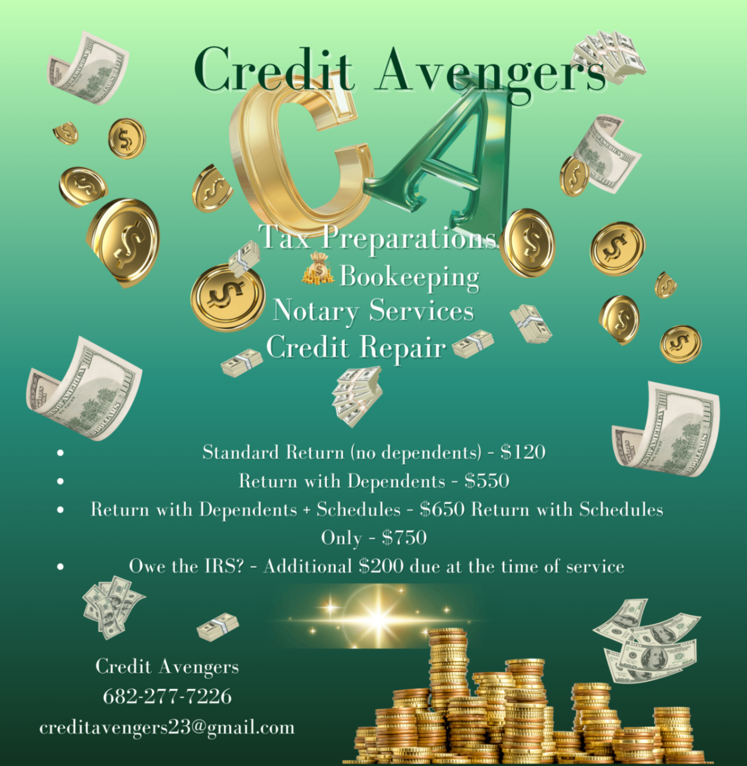 Small businesses don't just need tax prep – they need comprehensive financial support. That's why we bundle tax preparation with credit repair and bookkeeping services. Clean up your business credit while handling your taxes, and keep your books organized all year long. It's not just about surviving tax season; it's about building long-term financial strength.